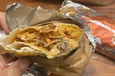 If you are looking for something to fill you up, this burrito is a great option. Upon picking up my foil-wrapped burrito, my first thought was: Dang, this thing has some weight to it. Not only does the burrito feel like it is double stuffed, but it's a decent size in both length and width. Once I unwrapped the burrito, I was instantly hit with the buttery, toasty smell of grilled cheese. On top of that, I was delighted to see a light coating of melted cheese, as promised.
